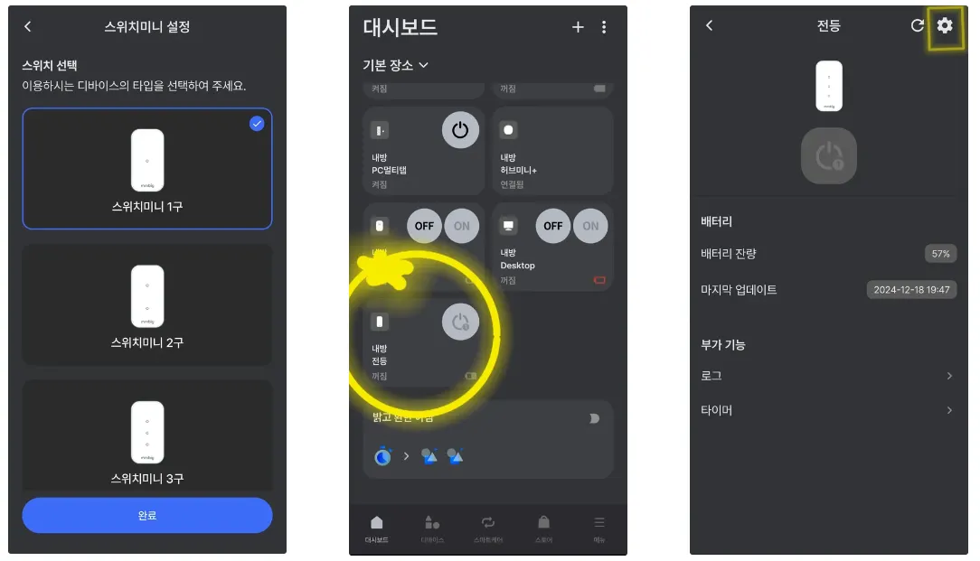 스위치 미니의 경우, 몇개짜리 스위치인지 선택 할 것 ( 뒷면에 스위치를 눌러주는 핀 개수가 다름)