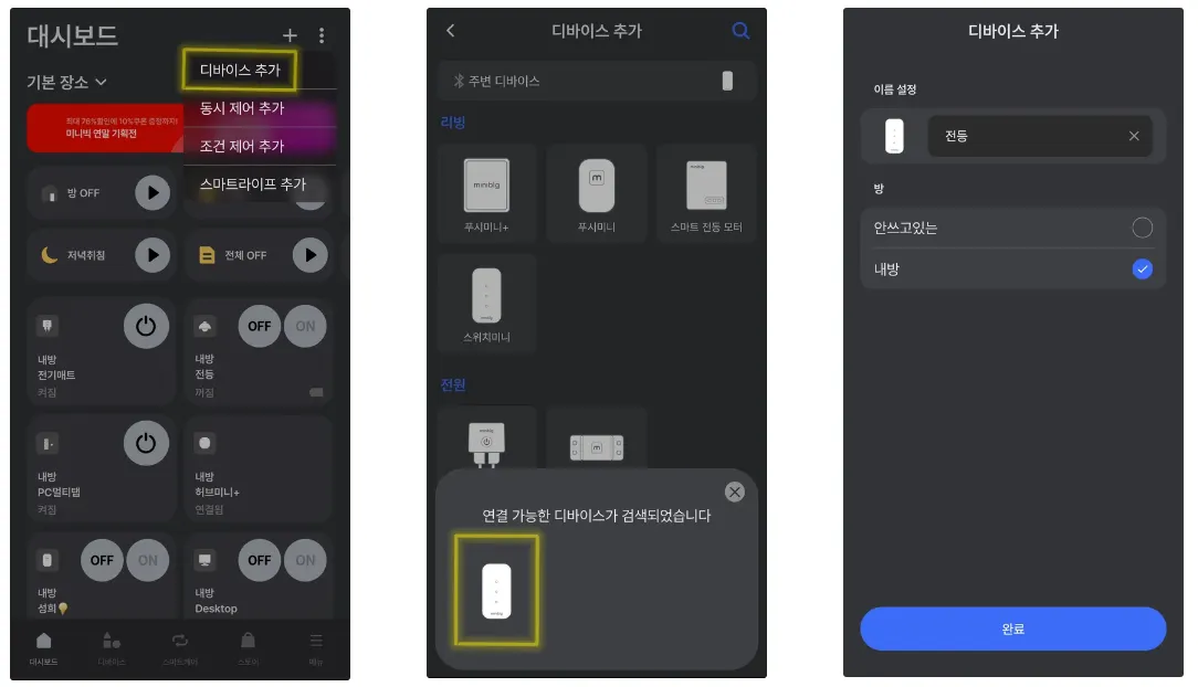 기기에 설정 할 이름과 방을 나눠뒀다면 선택 후 완료 누르기